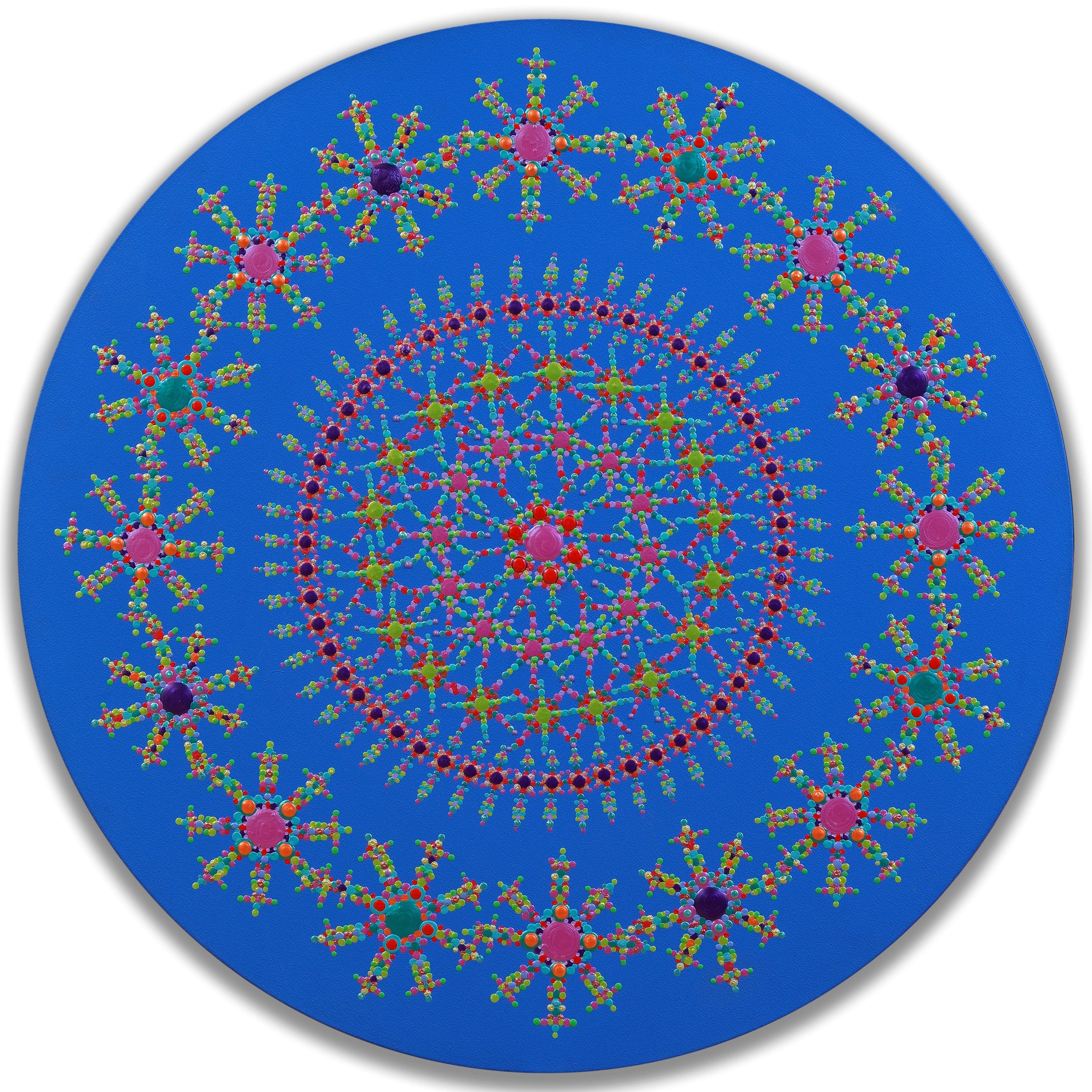 Inspiré par le mandala, symbole universel de l’unité et de l’infini, Duguay peint des compositions vibrantes où se rencontrent fleurs, étoiles, formes géométriques et fractales. Ses toiles et sculptures, souvent ponctuées de billes de métal ou de verre, créent des effets de relief et invitent à une expérience visuelle immersive. Ses œuvres récentes célèbrent la nature dans toute son allégresse, évoquant des jardins cosmiques et des mosaïques lumineuses.